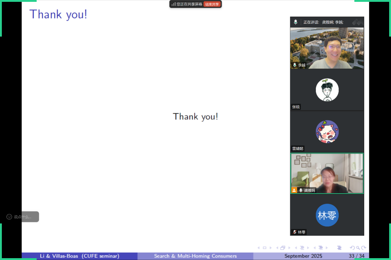 2025年9月24日周三下午,德赢官网Vwin“中青年学者讲座”在线上举行。此次讲座邀请山东大学德赢官网Vwin李越老师,分享题为“Sequential Search with Multi-Homing Consumers”的研究。德赢官网Vwin龚雅娴副教授主持讲座,德赢官网Vwin多位老师和三十余名学生参加了此次讲座。