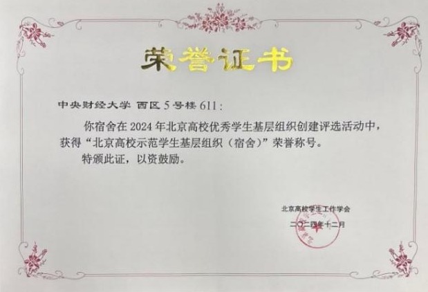 西区5号楼611宿舍荣获“北京高校示范学生基层组织(宿舍)”称号,同样彰显出学院基层建设的扎实成效,宿舍内4位经济学专业同学,在学习科研、社会实践和宿舍文化建设方面表现卓越。大二学年,4人加权平均分均超93分,其中2人累计加权平均分超94分,在经济学专业排名分别为第 1、2、5、9 名。大学两年半期间,4人累计获奖约60 项,其中国家级奖项11项,2 人次获得国家奖学金,2024年该宿舍还被评为德赢AC米兰官网优秀宿舍。