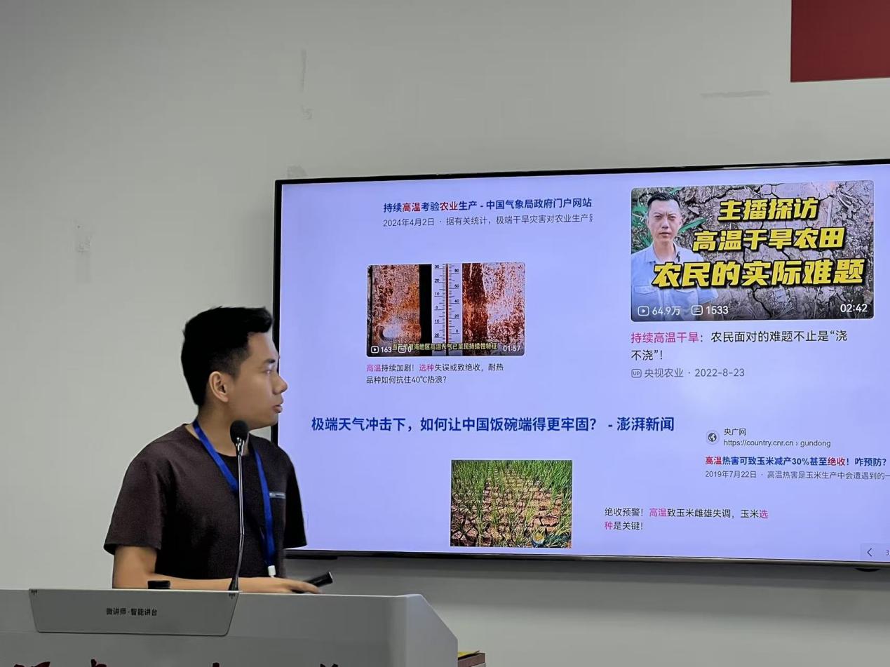 王家乐同学汇报的论文题目为《极端天气冲击、农业创新和农业韧性》,他的研究聚焦于极端天气事件对中国农业创新的影响及其在提升农业韧性中的作用。